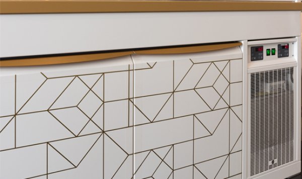 Weiß-Gold beschichten. Anschließend haben wir einen Teil der Fronten mit dem Muster, in Form einer Folie, beklebt.