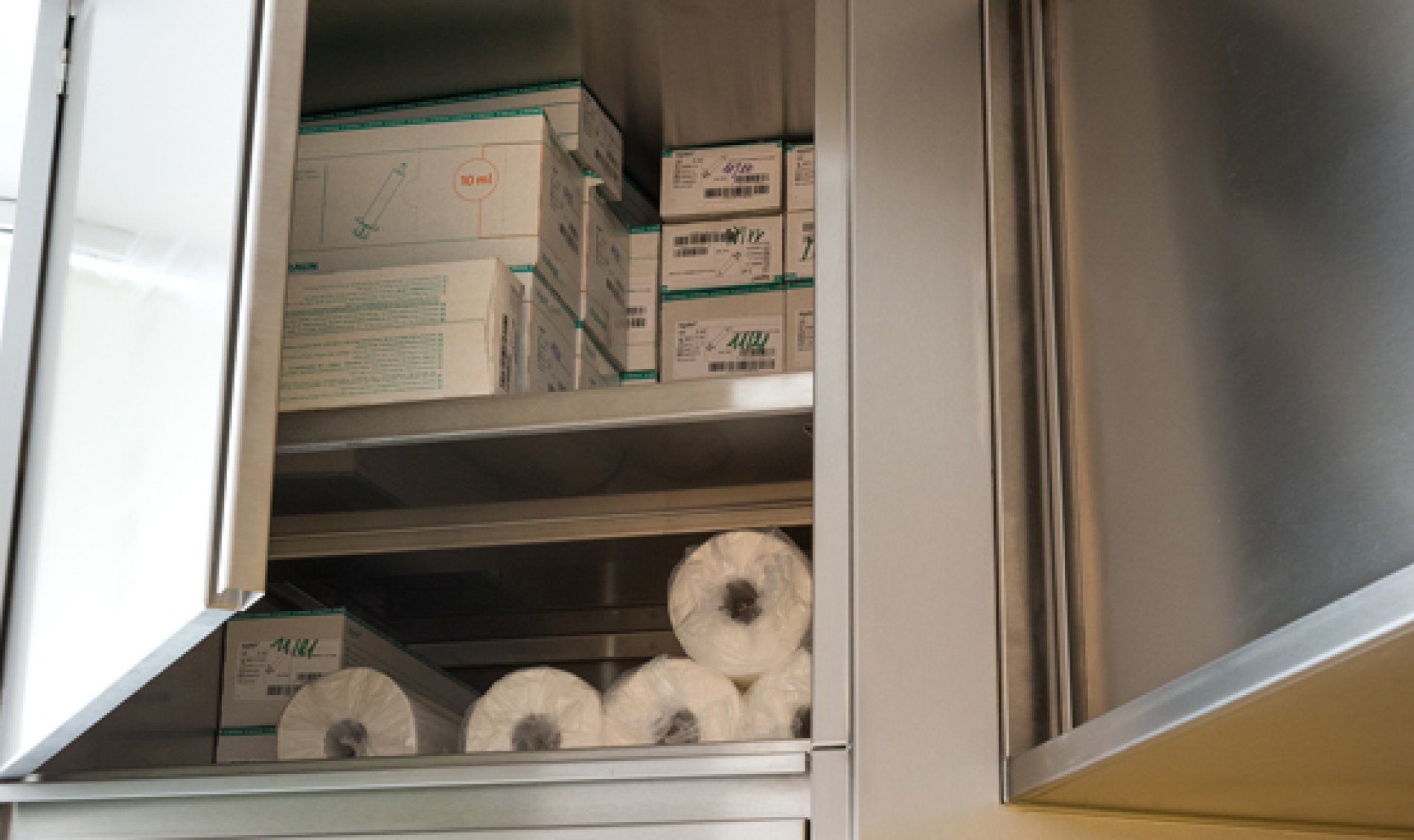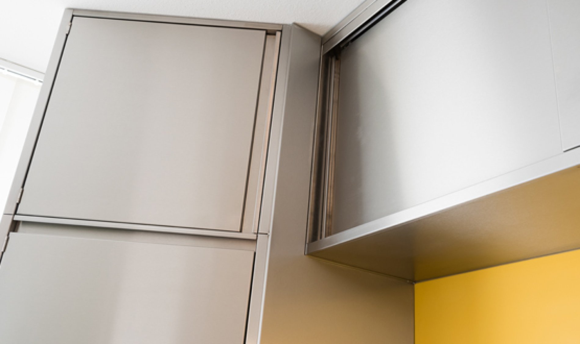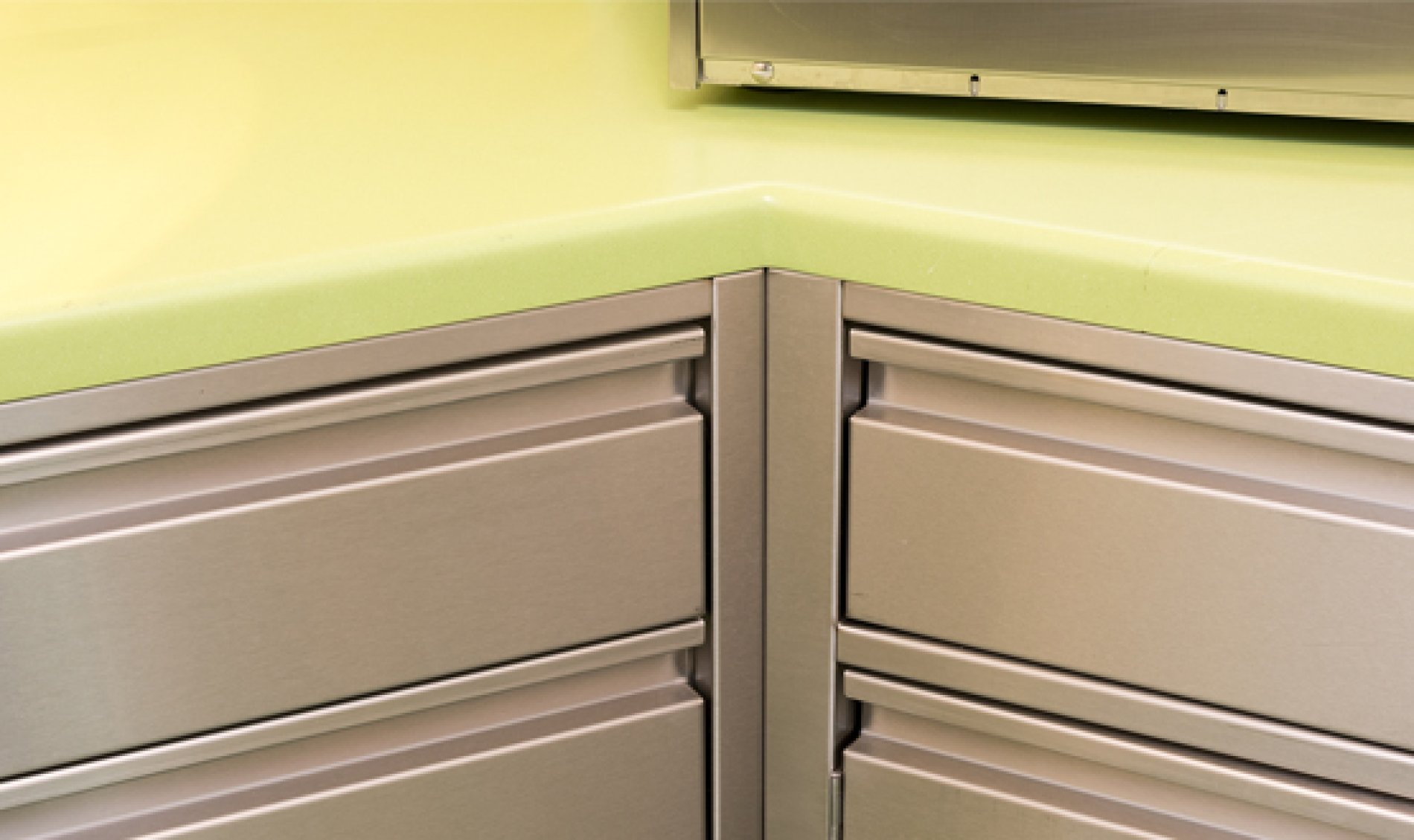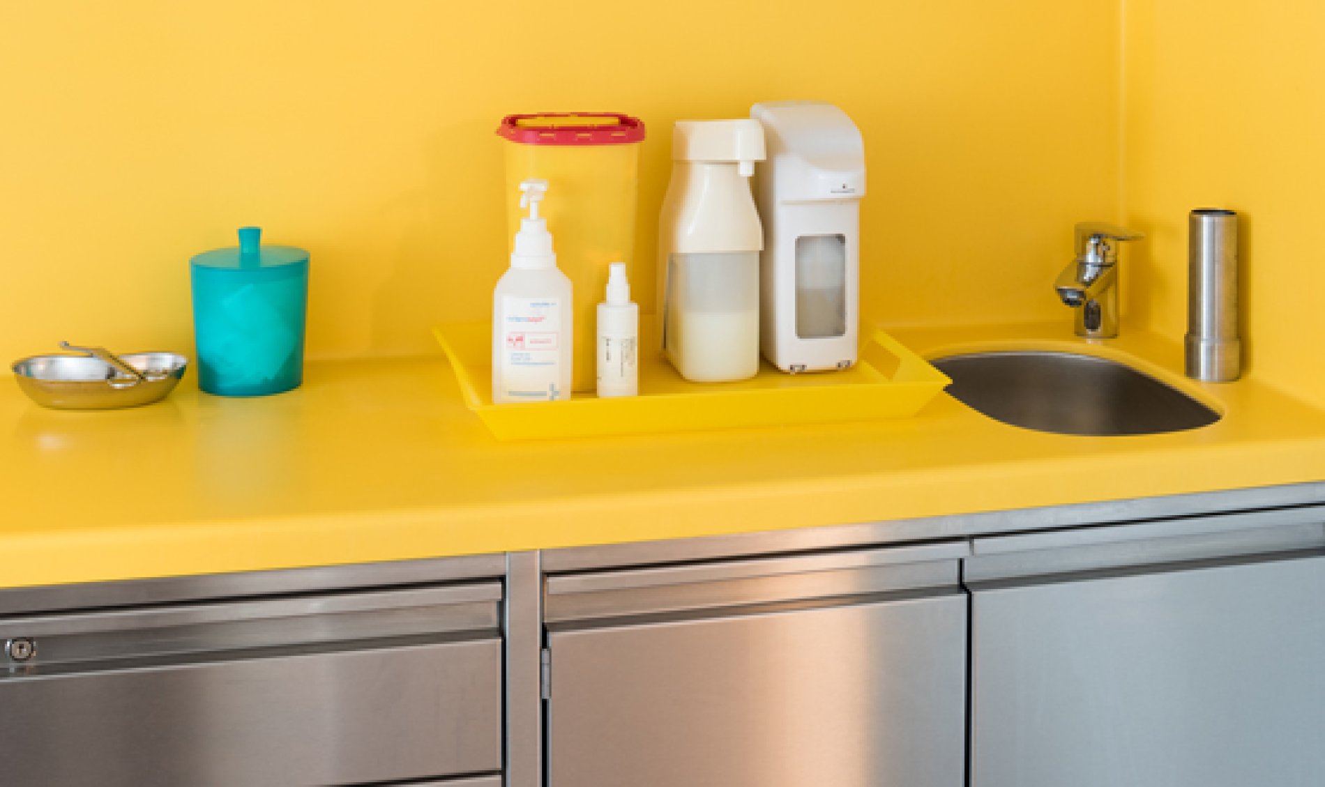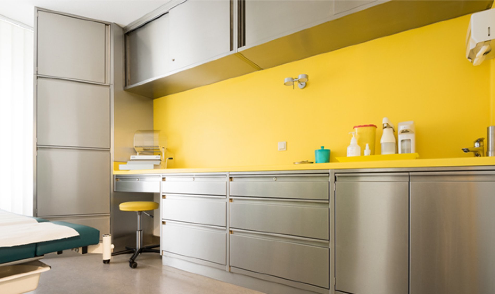 Im Jahre 2011 wurde der Endoskopiebereich der Praxis Dr. Wollein bereits gemeinsam mit der Firma METAGRO umgebaut. Damals galt es, die kniffelige Anforderung zu lösen, die Endoskopiewaschmaschinen so in die Edelstahlmöbel zu integrieren, dass sie für Servicearbeiten auch ausgezogen werden können. 2015 folgte dann der Umbau des Untersuchungs- und Eingriffsraumes. In der Praxis werden Magenspielgelungen, aber auch kleinere ambulante Operationen durchgeführt. War der Endoskopiebereich in der Farbe Grün gelöst, so ist dieser auch für Patienten vorgesehene Bereich in freundlichem, sattem Gelb gestaltet - eine wohltuende Kombination zu der Kühle und Hygienekompetenz des Edelstahls. Eine gelbe Corian-Platte mit fugenlosen Wandhochzügen und über drei Metern Länge sowie einem Meter Höhe fungiert somit als freundlicher Blickfänger und beruhigendes Gestaltungselement. Das Besondere an dem Projekt sind vor allem die individuellen, maßgefertigten Möbel mit Sonderbreiten und -höhen der Laden und eine spezielle Befestigungsmöglichkeit für einen bauseitigen Safe.