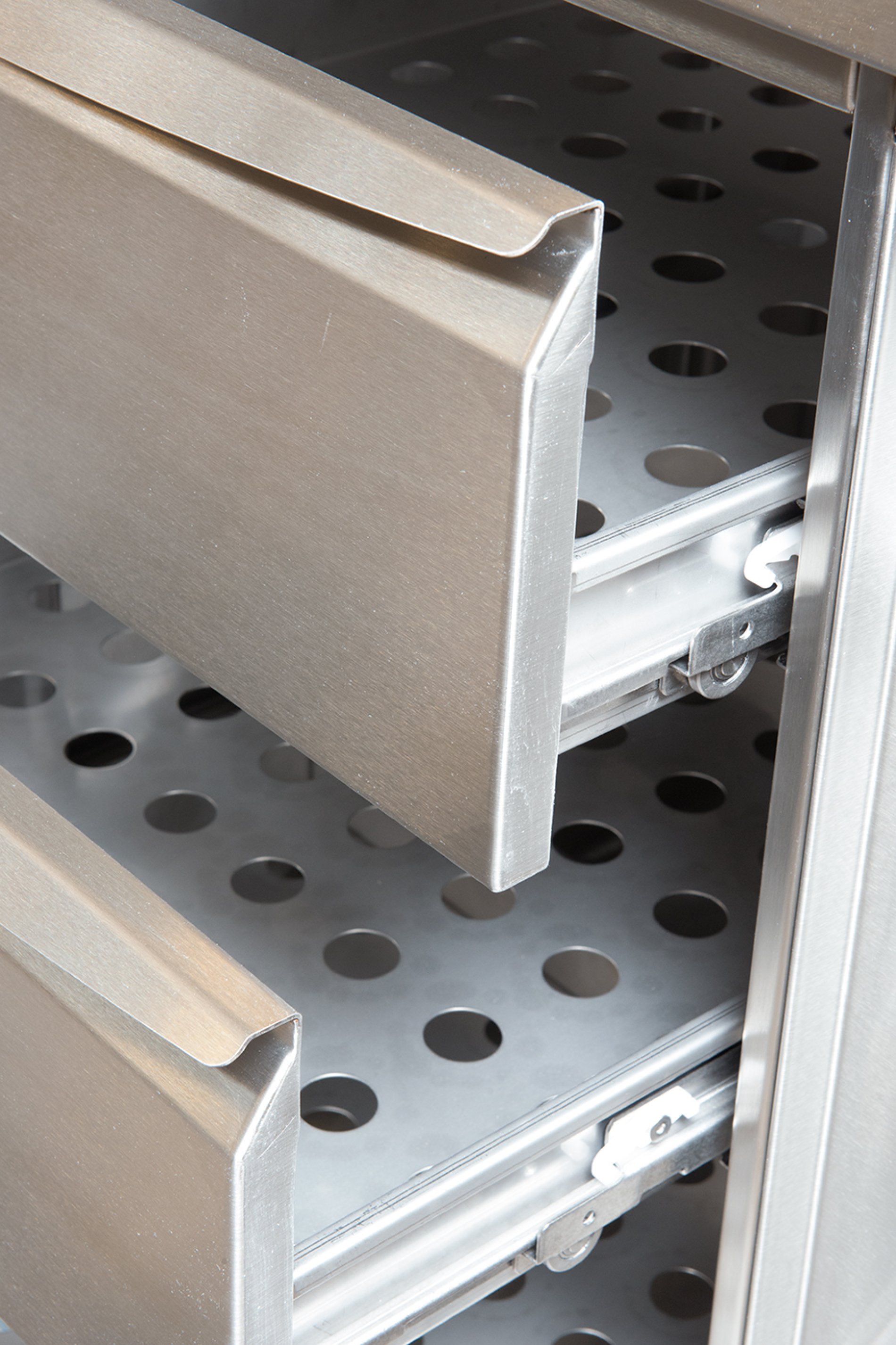 Die Wärmeschränke sind auch als Tassenwärmeschränke mit gelochten Ladenkästen und Vollauszug erhältlich.