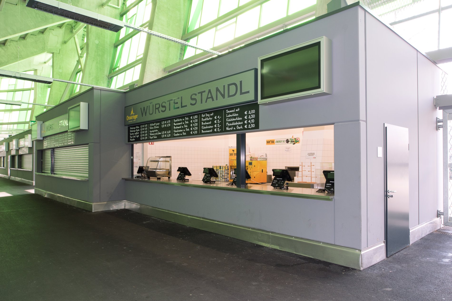 Fußballfans dürfen sich neben verbesserten Sicherheitsstandards auf modernen Stadionkomfort freuen. Im Nord-, Süd- und Ostteil des Stadions wurden 24 sogenannte „Kioske“ plaziert, die mit Kühl- und Zapfmöbeln sowie Sonderkühlmöbeln von METAGRO ausgestattet worden sind. Auch die Ausgabemöbel sowie die Spültische stammen aus dem Hainfelder Unternehmen. Die Abstellborde für die Fans wurden aus besonders dicken 3mm-Blechen komplett in Edelstahl gefertigt. Es wurde die sonst übliche Spanplattenunterfütterung komplett durch Edelstahl ersetzt.