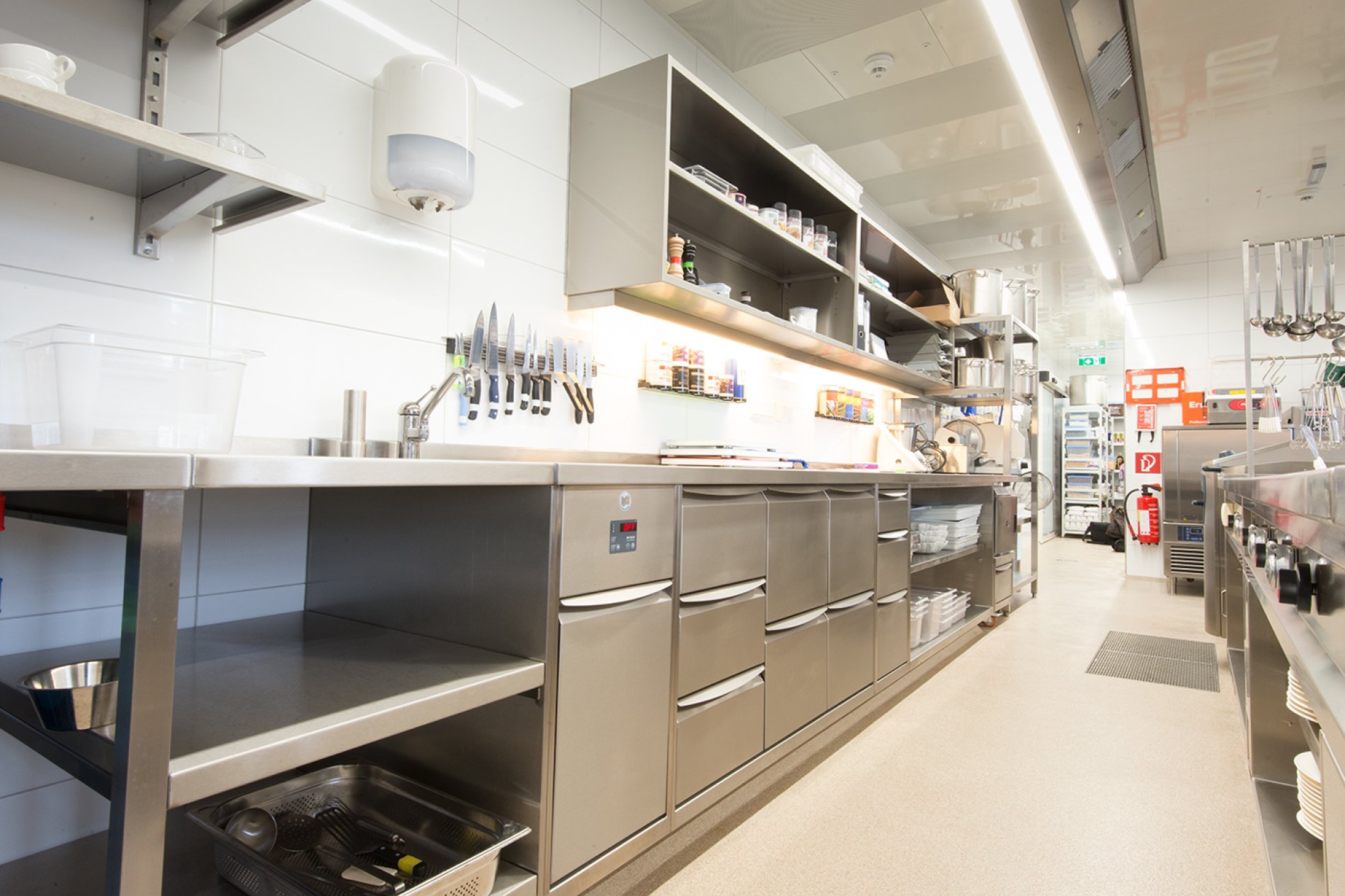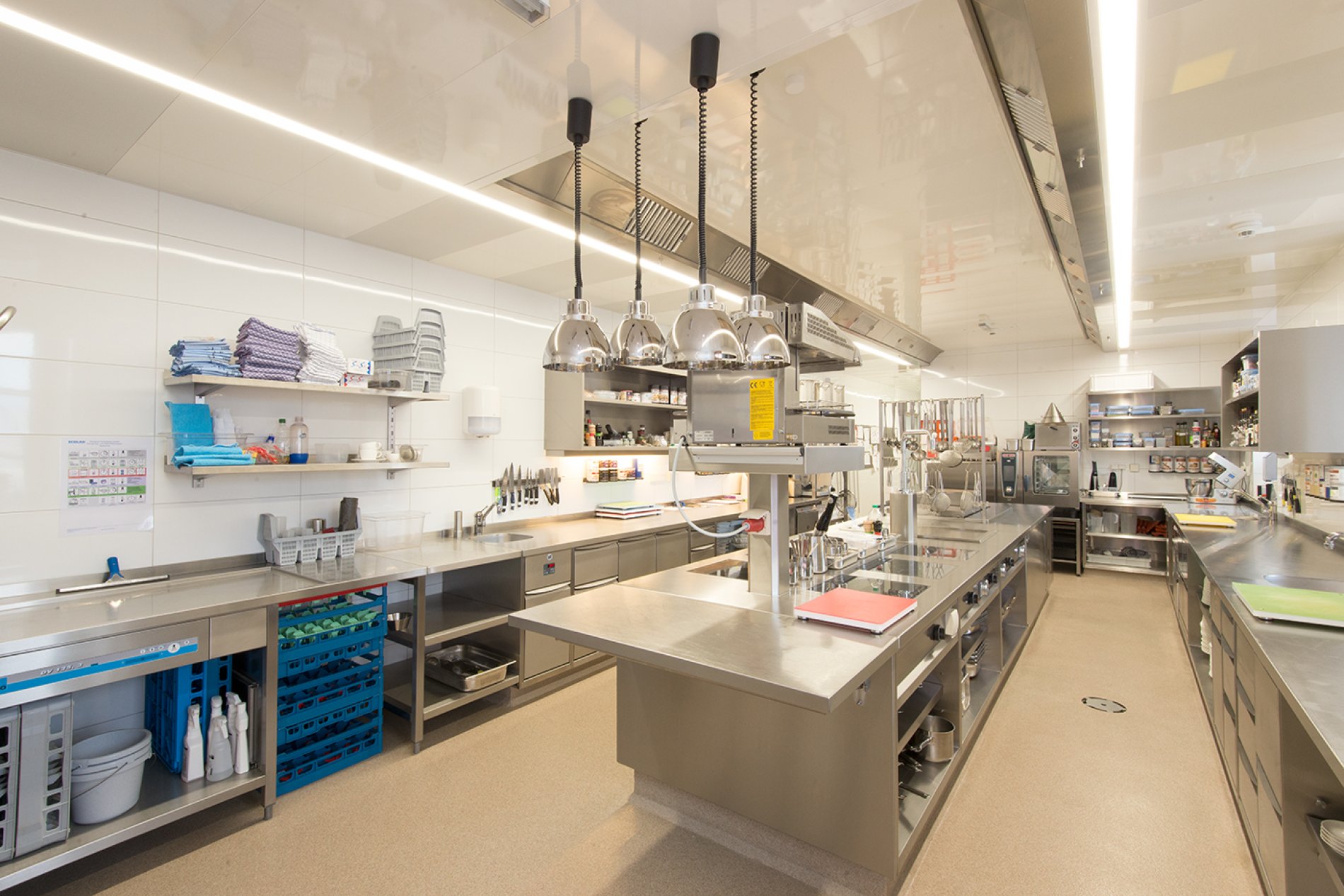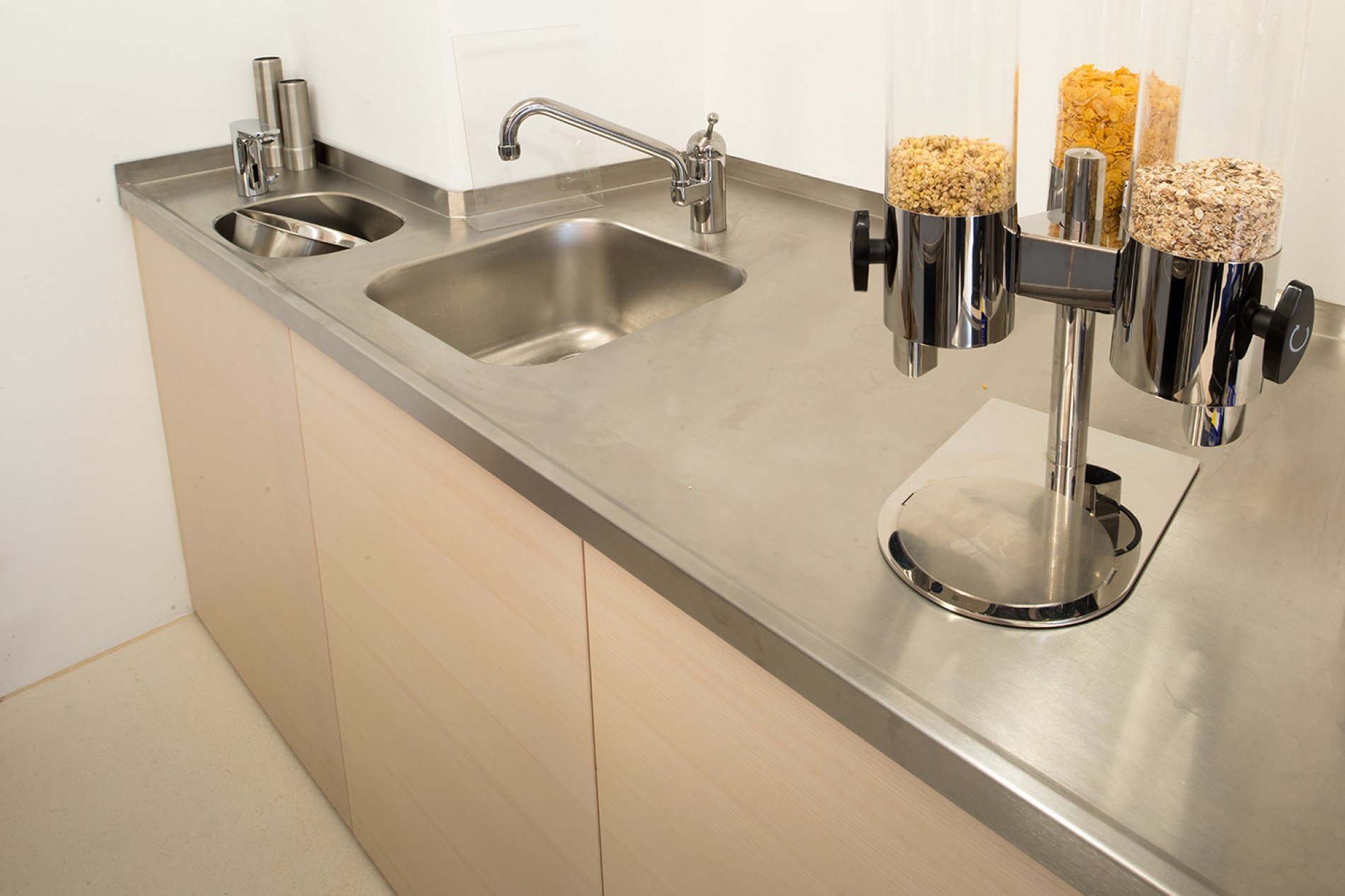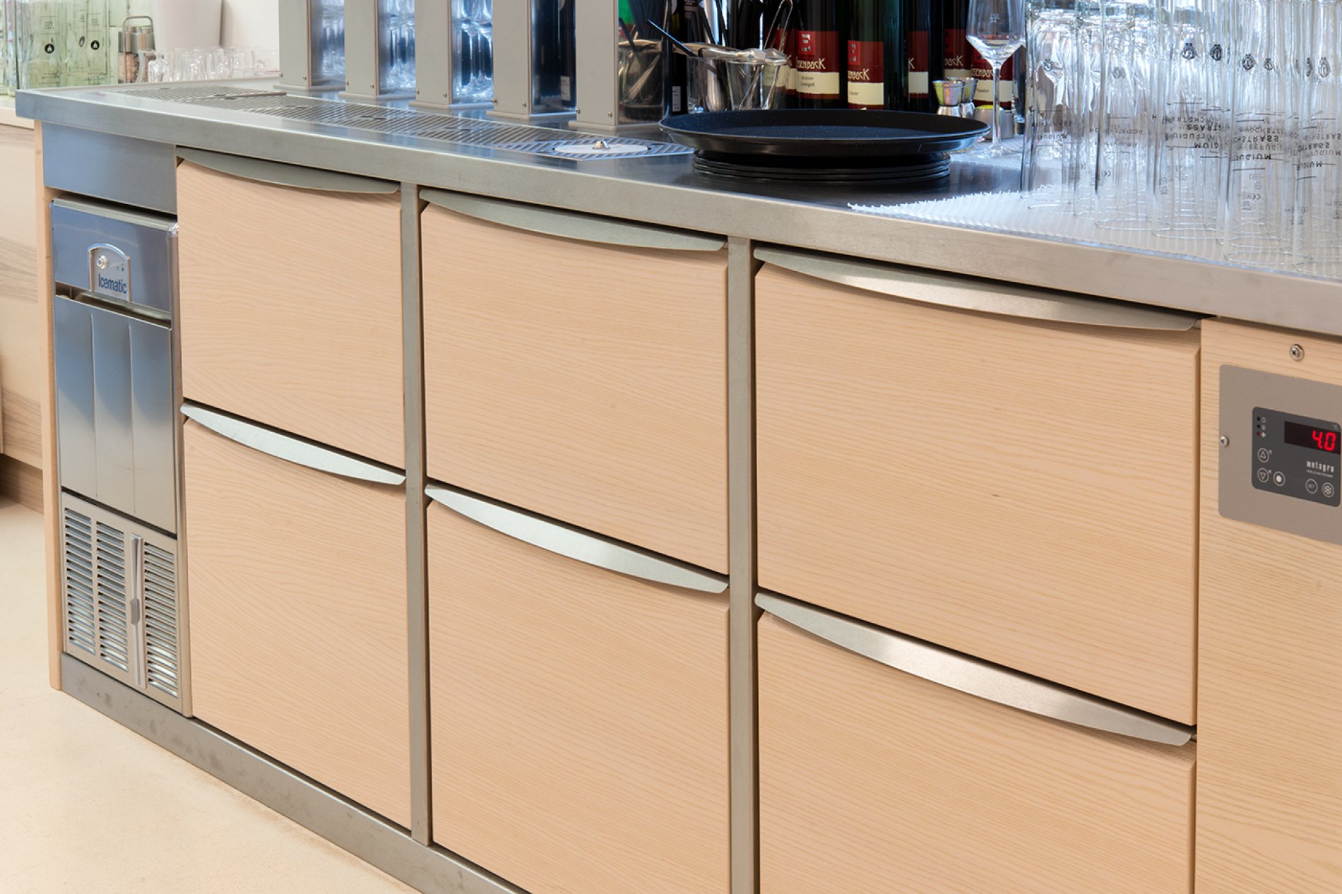 Die Arbeitsplatten wurden vor Ort fugenlos verschweißt. Die Arbeitsplatten mit Fensteranschluss wurden als Nischenverkleidung fugenlos an die historische Gebäudesituation angepasst. Auch bei diesem Projekt erfolgte die Naturmaßnahme mit dem millimetergenauen Flexijet-System. Eine spezielle Arbeitsplatte mit Steineinlage in der Patisserie sorgt für optimales Arbeiten der Mehlspeisköche. Die Schränke wurden in der Ausführung H1M Swingline mit gerundeten Griffleisten und hygienisch dichtem Boden geliefert. Die Getränkekühlung punktet mit edlem Holzdekor, passend zum Interior Design des Hauses.
