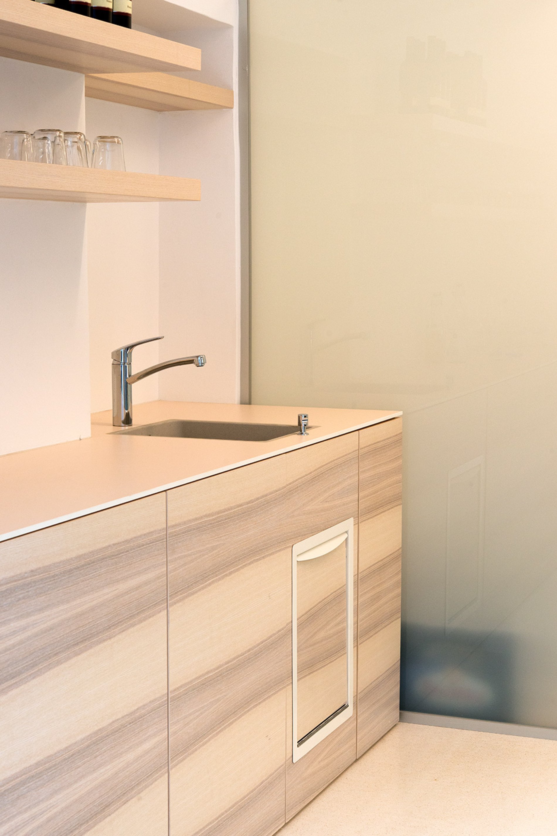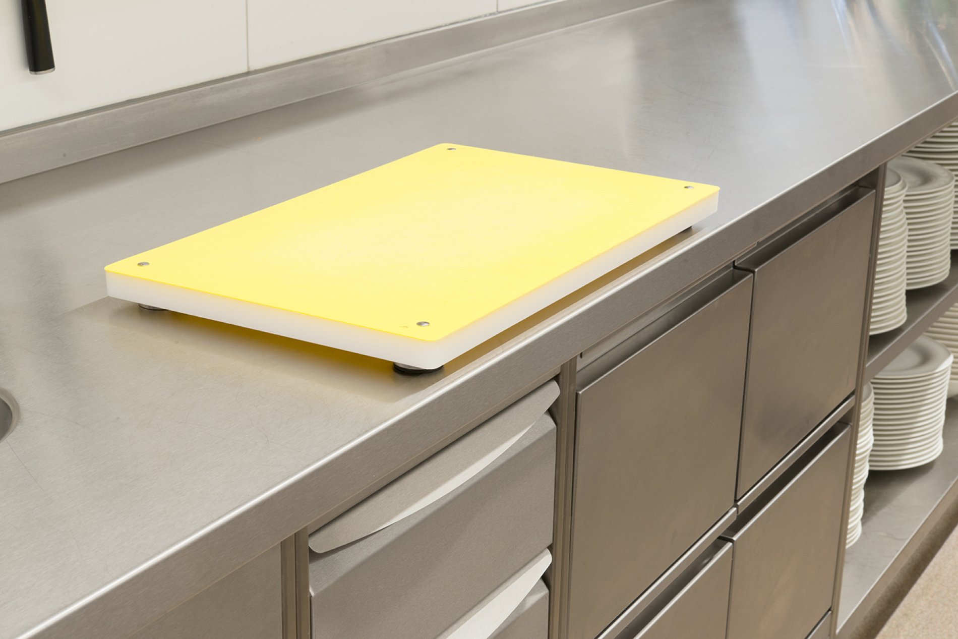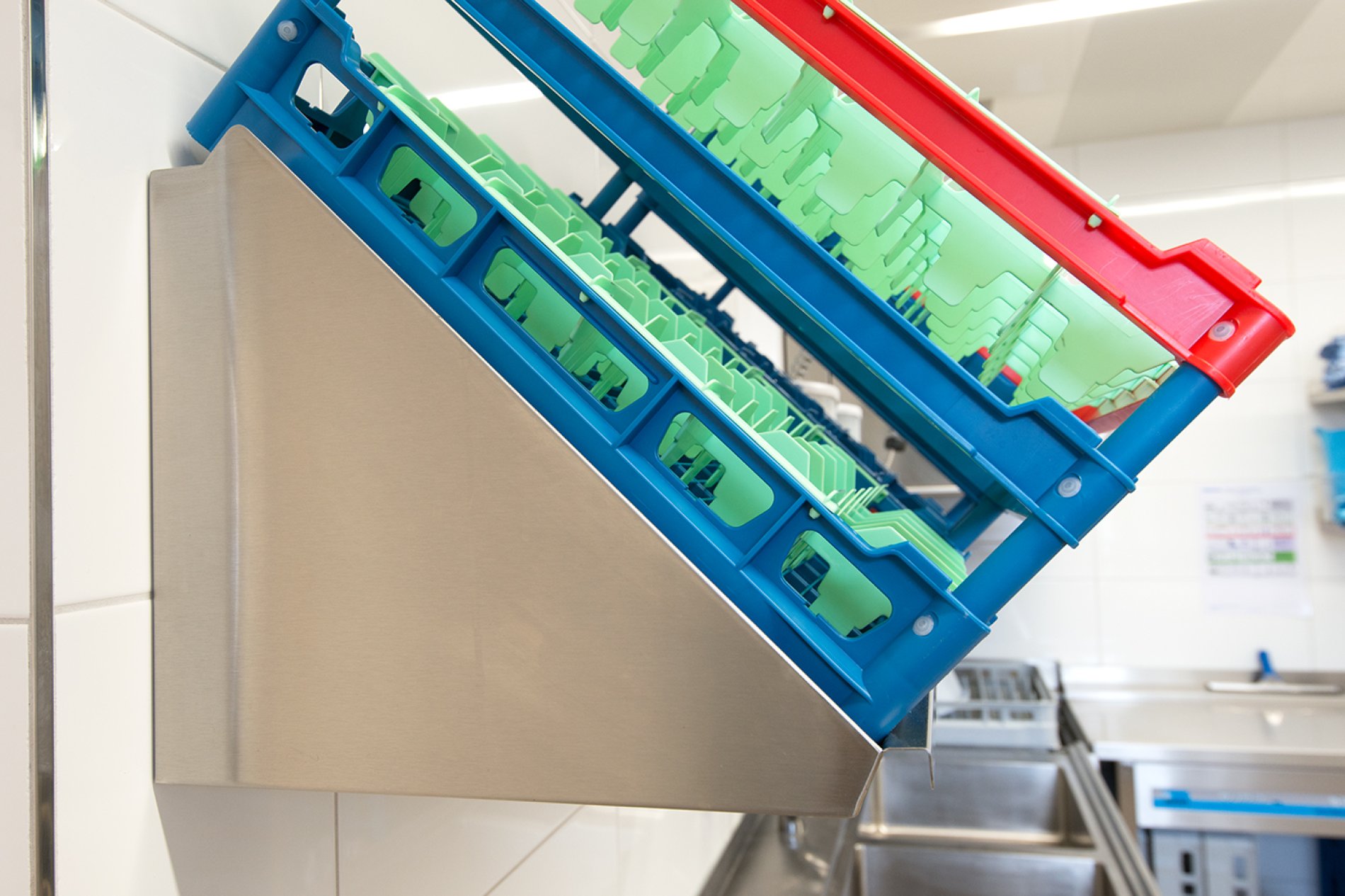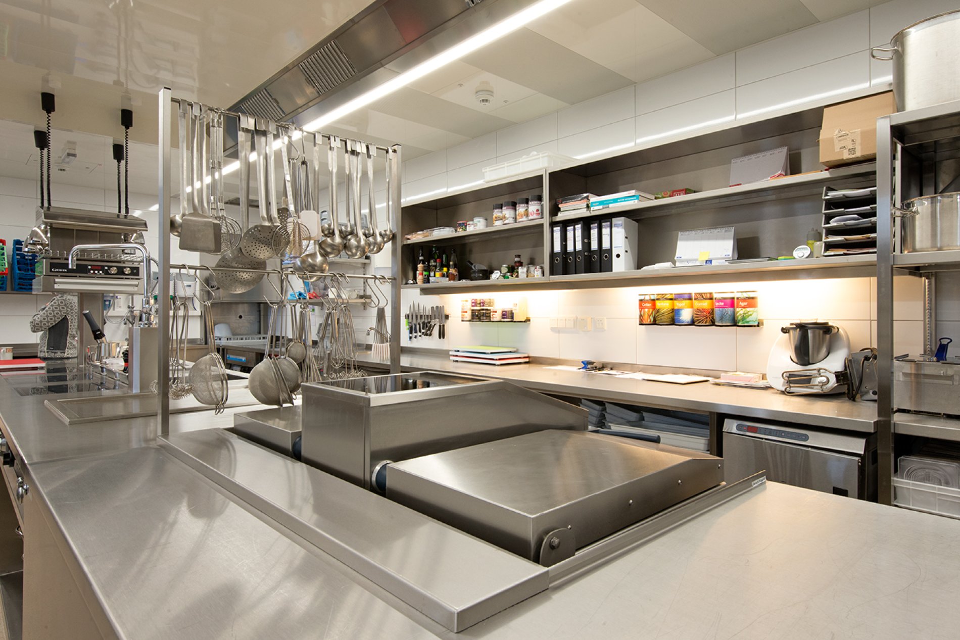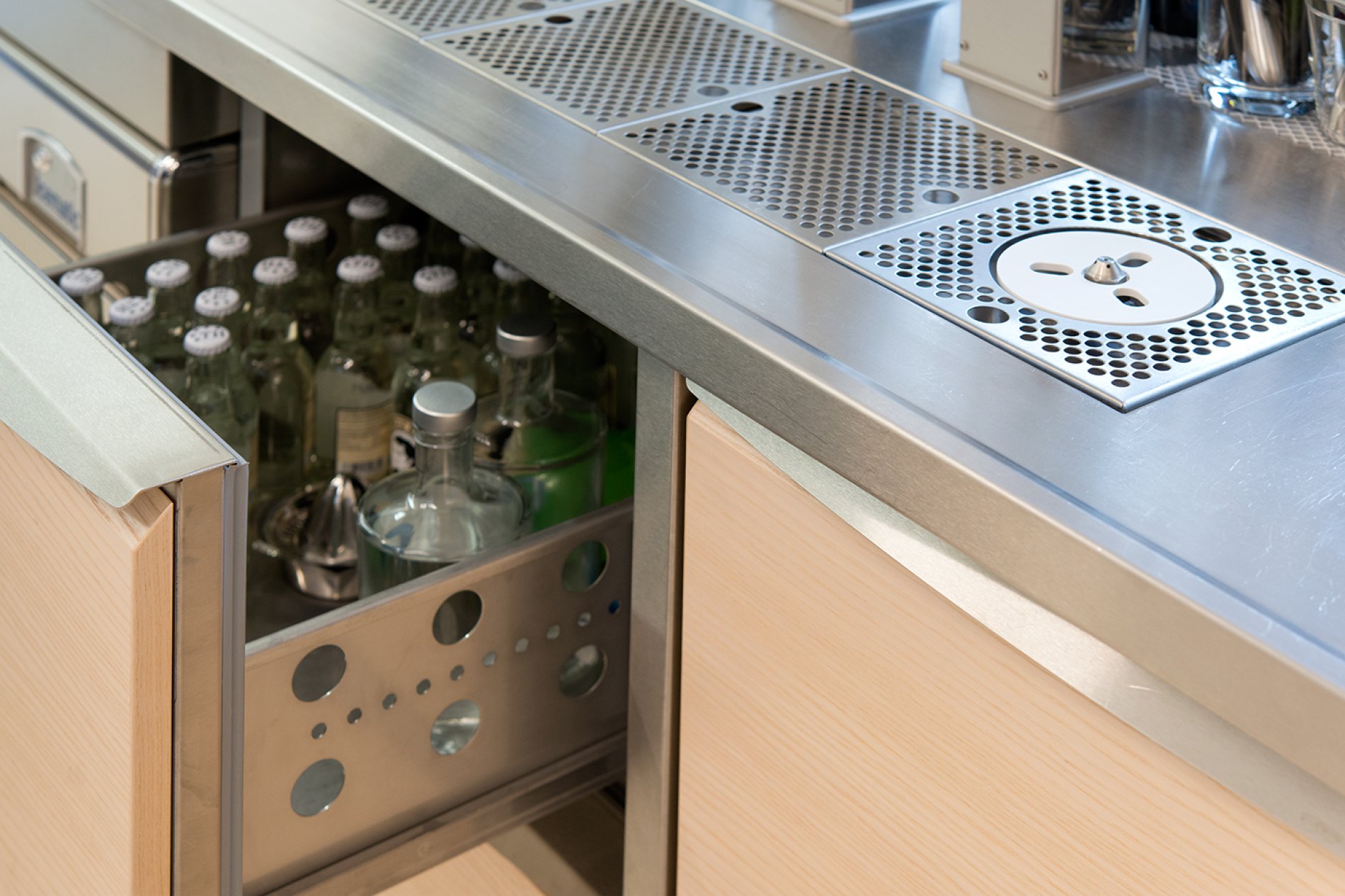 Die Arbeitsplatten wurden vor Ort fugenlos verschweißt. Die Arbeitsplatten mit Fensteranschluss wurden als Nischenverkleidung fugenlos an die historische Gebäudesituation angepasst. Auch bei diesem Projekt erfolgte die Naturmaßnahme mit dem millimetergenauen Flexijet-System. Eine spezielle Arbeitsplatte mit Steineinlage in der Patisserie sorgt für optimales Arbeiten der Mehlspeisköche. Die Schränke wurden in der Ausführung H1M Swingline mit gerundeten Griffleisten und hygienisch dichtem Boden geliefert. Die Getränkekühlung punktet mit edlem Holzdekor, passend zum Interior Design des Hauses.