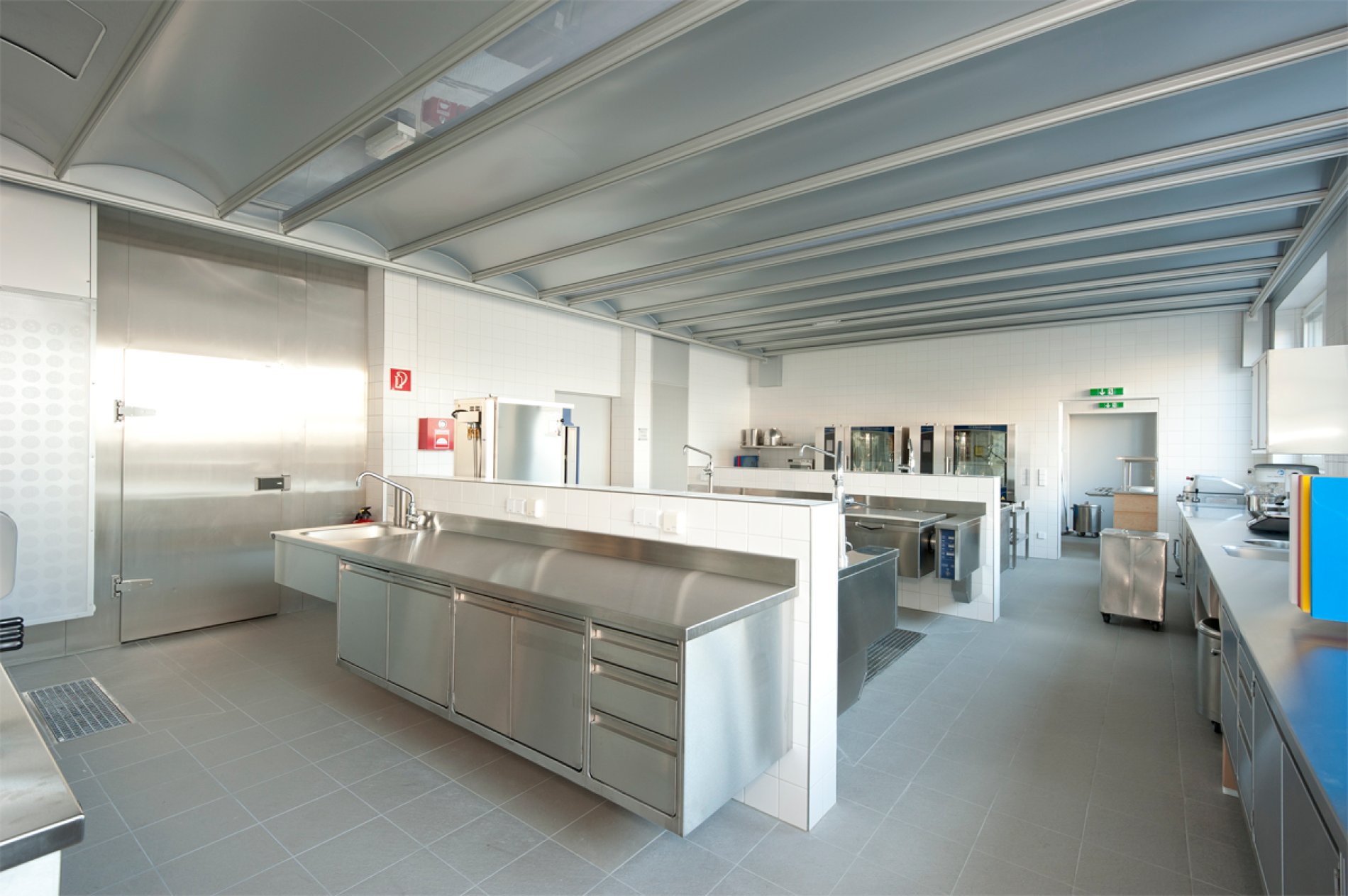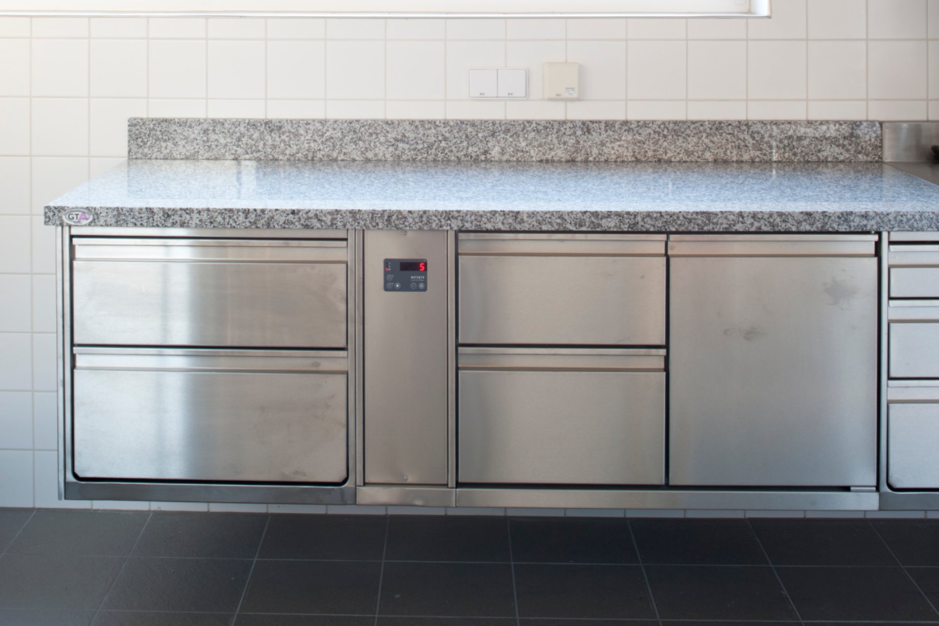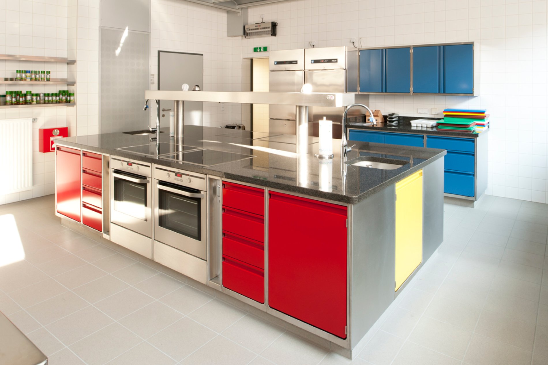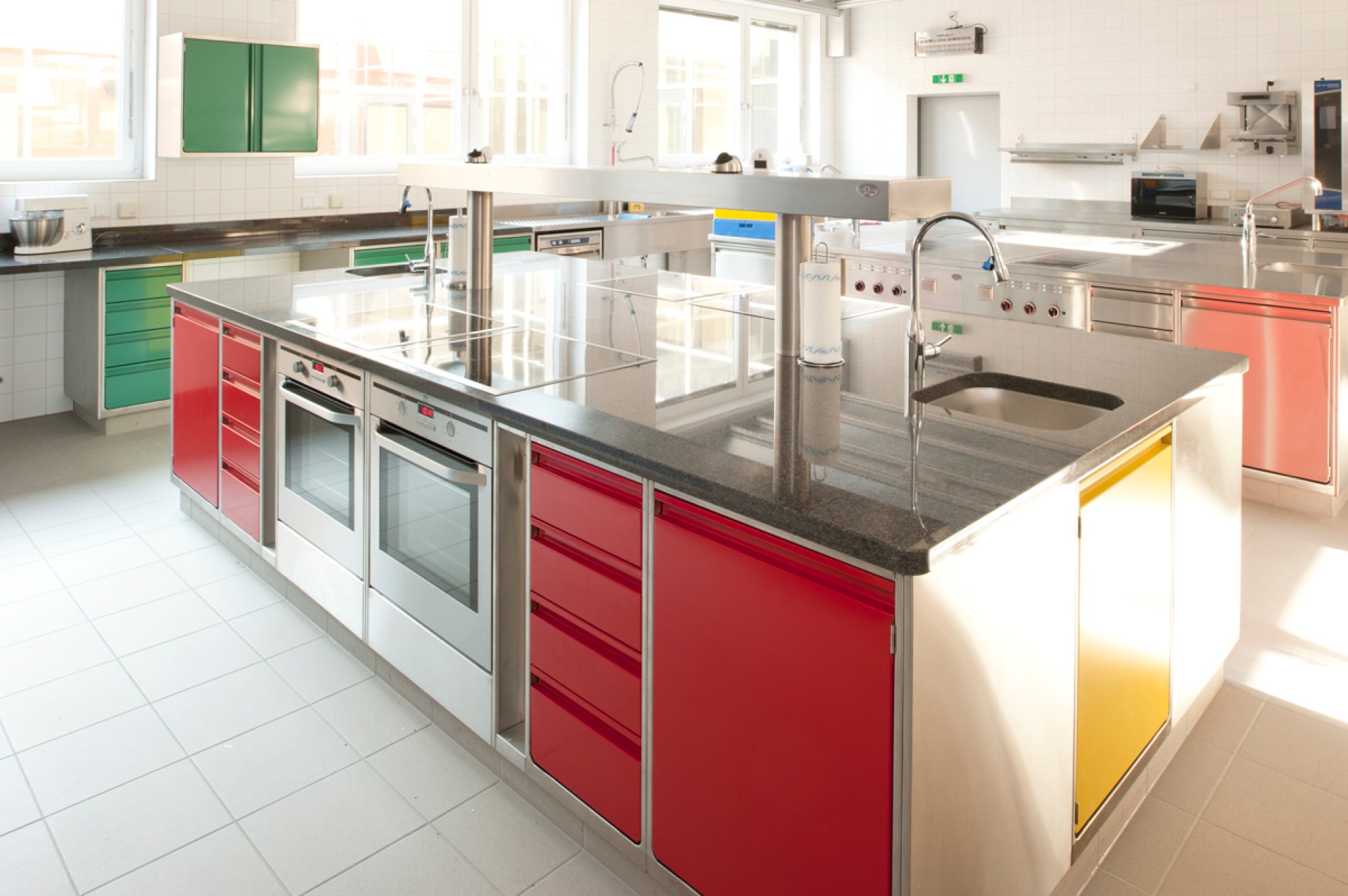 Professionelle Schulung bedarf einer professionellen Infrastruktur. Daher entschied man sich für eine H2-Hygieneküche von METAGRO. Die unterschiedlich pulverbeschichteten Farbbereiche (RAL 5007, 6000, 1012 und 3002) ermöglichen dabei den SchülerInnen das leichtere Auffinden der Koch-Utensilien in der Schulküche. Die wandhängende Ausführung der Schränke macht die Bodenreinigung unkomplizierter und ist somit hygienischer. Erwähnenswert ist auch der integrierte Haushaltselektroherd und die Arbeitsplatten aus Impala-Granitplatten.