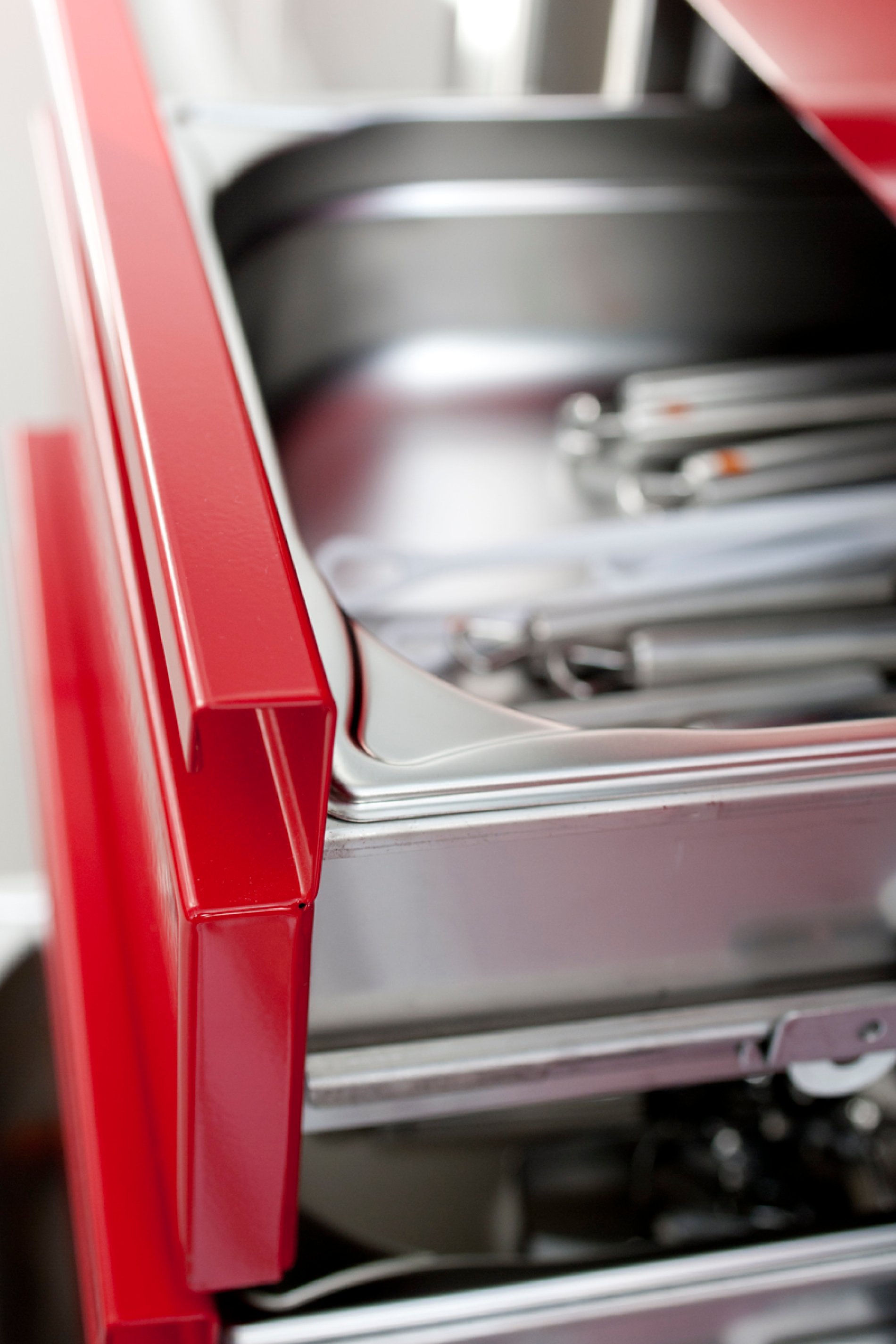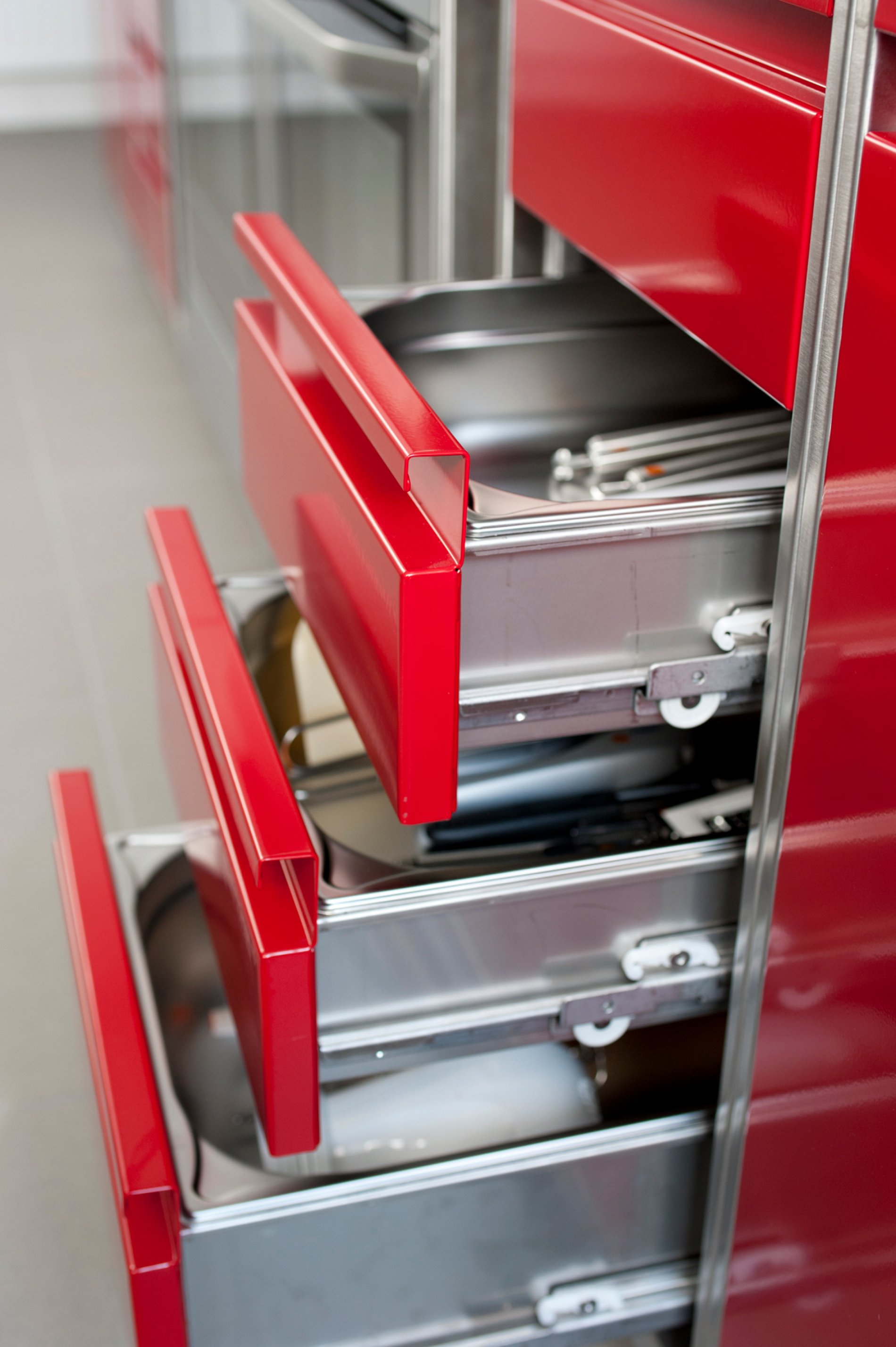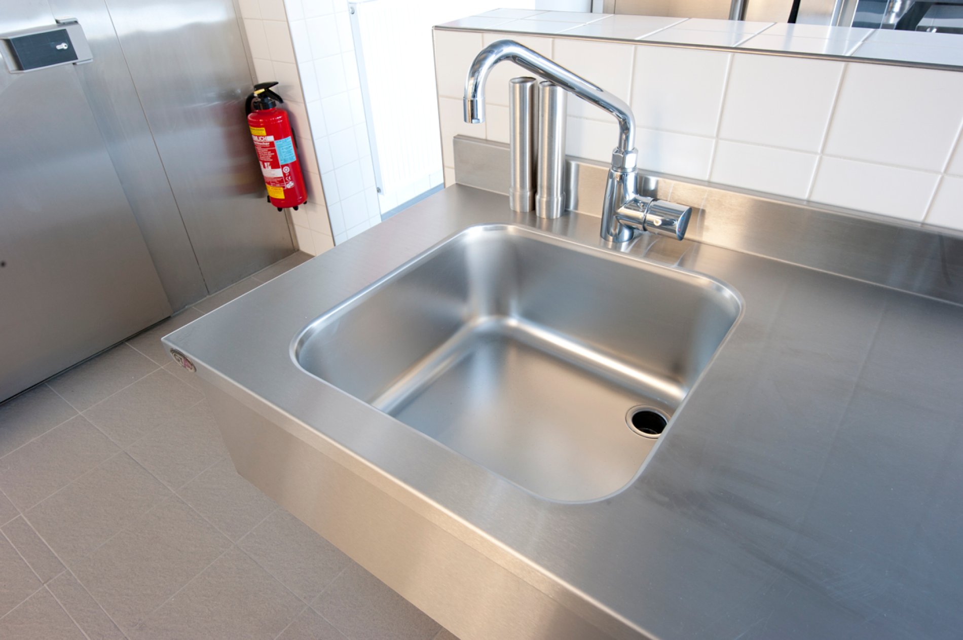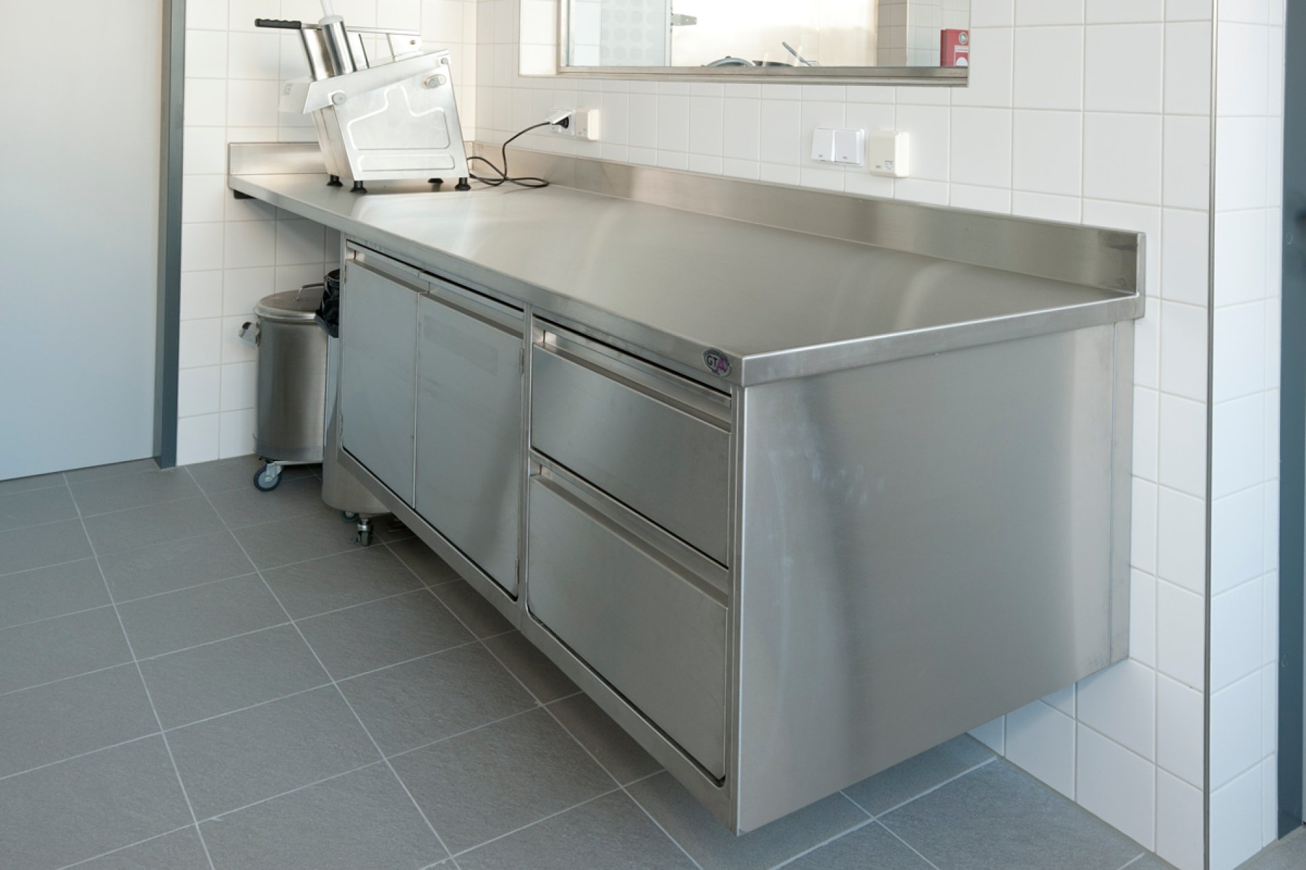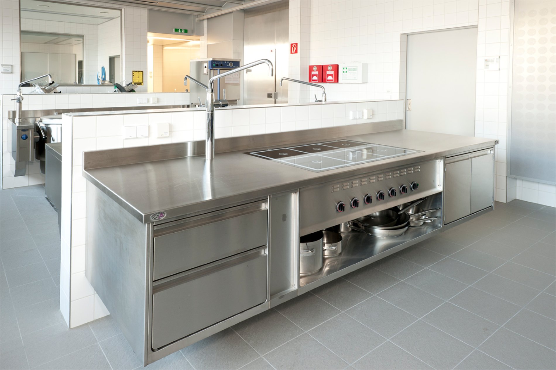 Professionelle Schulung bedarf einer professionellen Infrastruktur. Daher entschied man sich für eine H2-Hygieneküche von METAGRO. Die unterschiedlich pulverbeschichteten Farbbereiche (RAL 5007, 6000, 1012 und 3002) ermöglichen dabei den SchülerInnen das leichtere Auffinden der Koch-Utensilien in der Schulküche. Die wandhängende Ausführung der Schränke macht die Bodenreinigung unkomplizierter und ist somit hygienischer. Erwähnenswert ist auch der integrierte Haushaltselektroherd und die Arbeitsplatten aus Impala-Granitplatten.