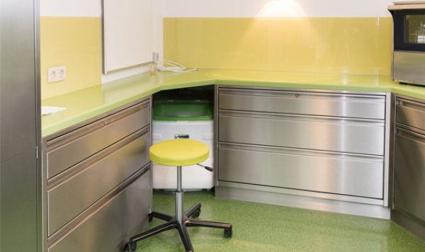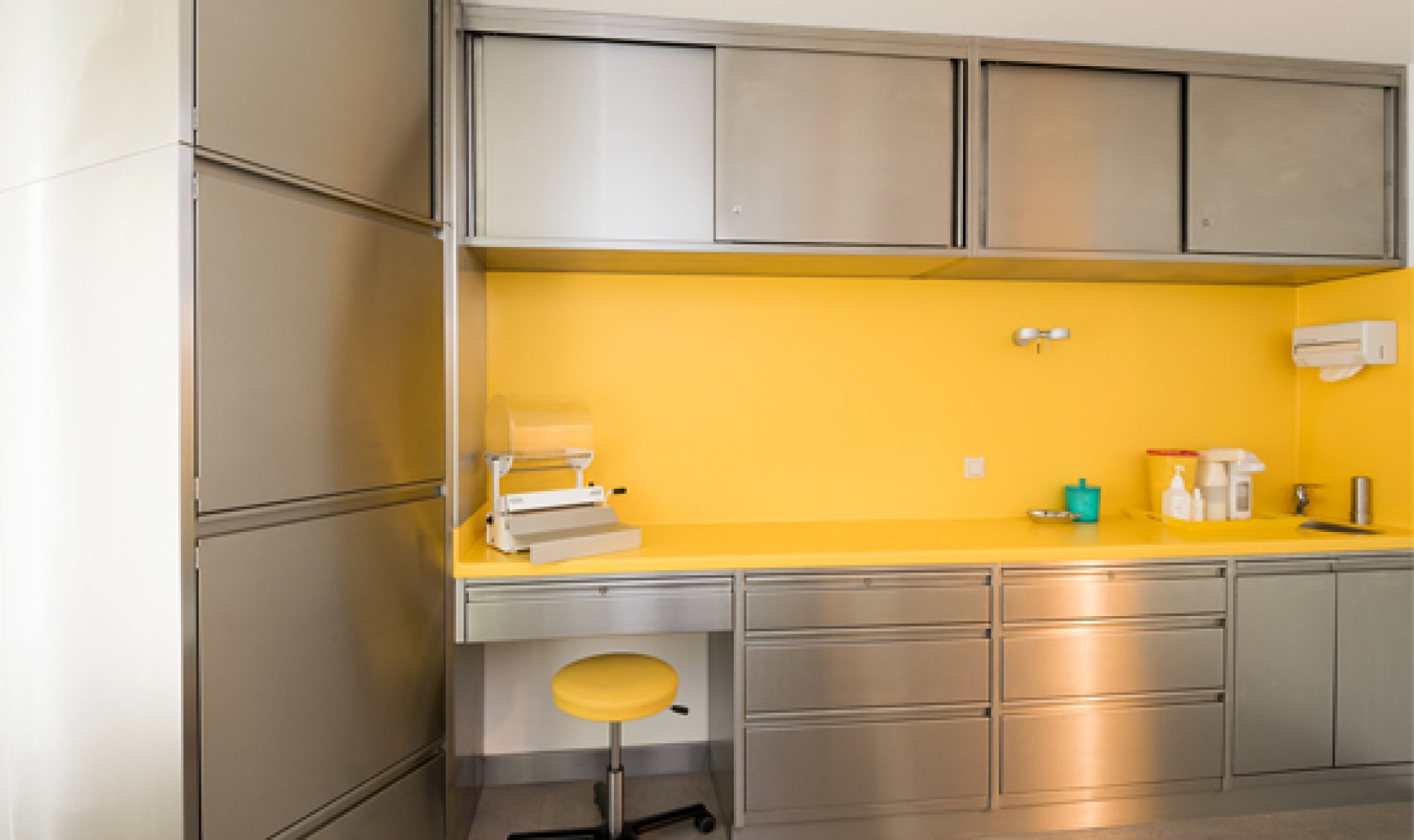 Im Jahre 2011 wurde der Endoskopiebereich der Praxis Dr. Wollein bereits gemeinsam mit der Firma METAGRO umgebaut. Damals galt es, die kniffelige Anforderung zu lösen, die Endoskopiewaschmaschinen so in die Edelstahlmöbel zu integrieren, dass sie für Servicearbeiten auch ausgezogen werden können. 2015 folgte dann der Umbau des Untersuchungs- und Eingriffsraumes. In der Praxis werden Magenspielgelungen, aber auch kleinere ambulante Operationen durchgeführt. War der Endoskopiebereich in der Farbe Grün gelöst, so ist dieser auch für Patienten vorgesehene Bereich in freundlichem, sattem Gelb gestaltet - eine wohltuende Kombination zu der Kühle und Hygienekompetenz des Edelstahls. Eine gelbe Corian-Platte mit fugenlosen Wandhochzügen und über drei Metern Länge sowie einem Meter Höhe fungiert somit als freundlicher Blickfänger und beruhigendes Gestaltungselement. Das Besondere an dem Projekt sind vor allem die individuellen, maßgefertigten Möbel mit Sonderbreiten und -höhen der Laden und eine spezielle Befestigungsmöglichkeit für einen bauseitigen Safe.